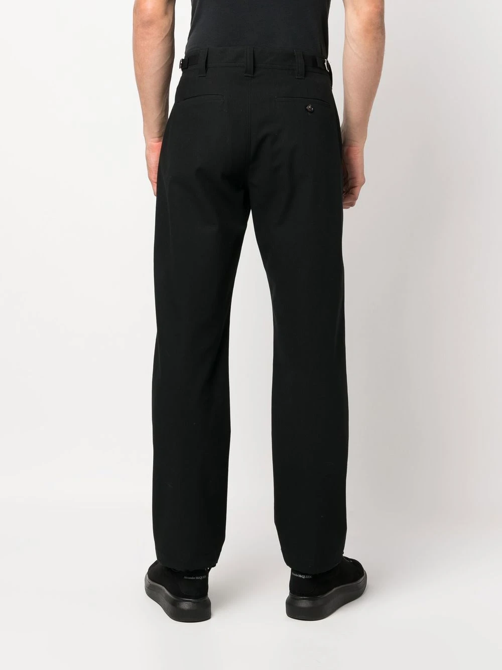 drawstring-hem cotton trousers from Alexander McQueen featuring black, cotton, belt loops, button fastening, zip fly fastening, belted waist tabs, two side inset pockets, rear jetted pocket, rear button-fastening jetted pocket, straight leg and drawstring hem. Organic cotton trousers This piece fits true to size. We recommend you get your regular size. Model is 1,84m / 6ft 1in wearing size 48 (IT)Item #: