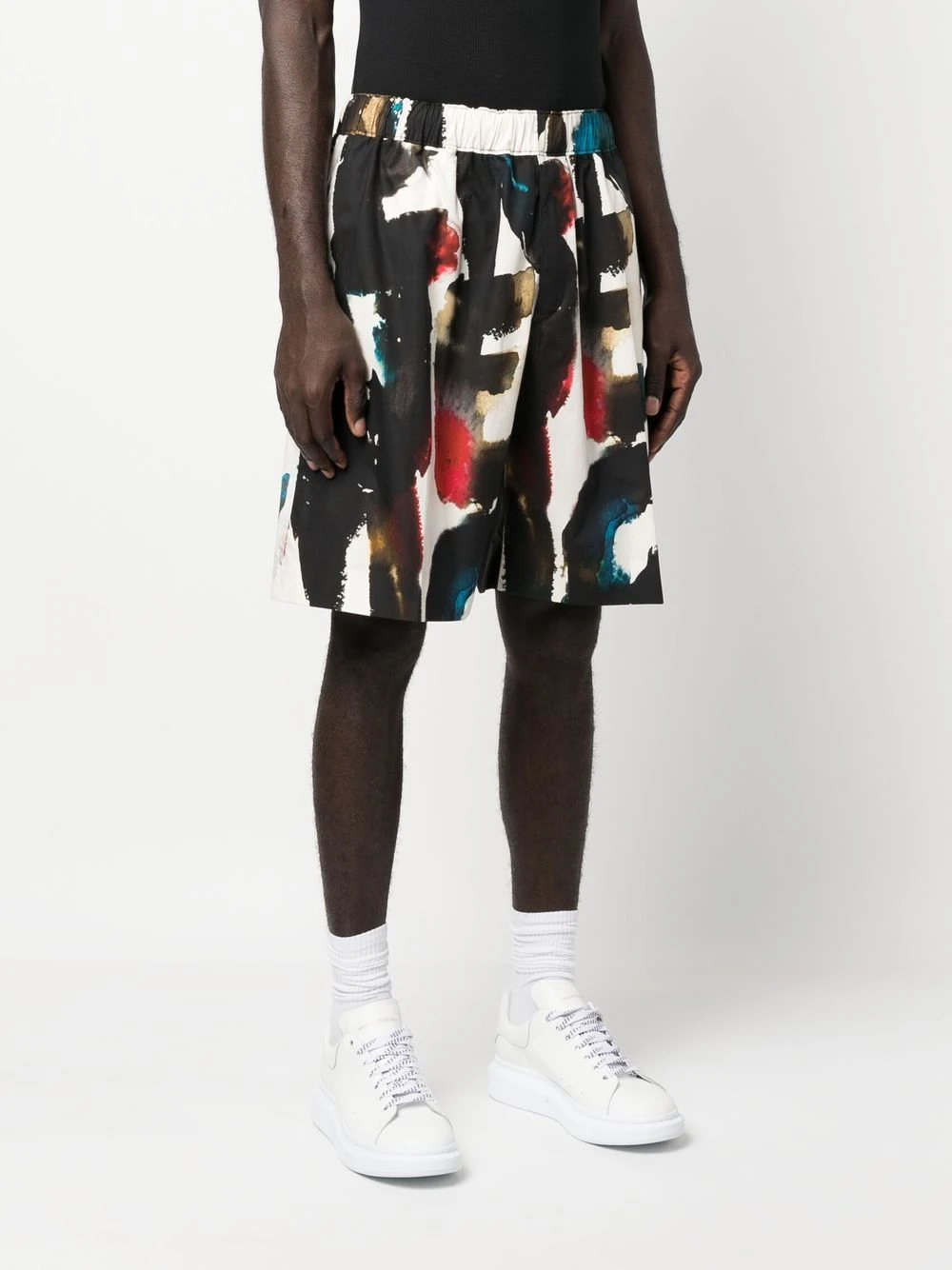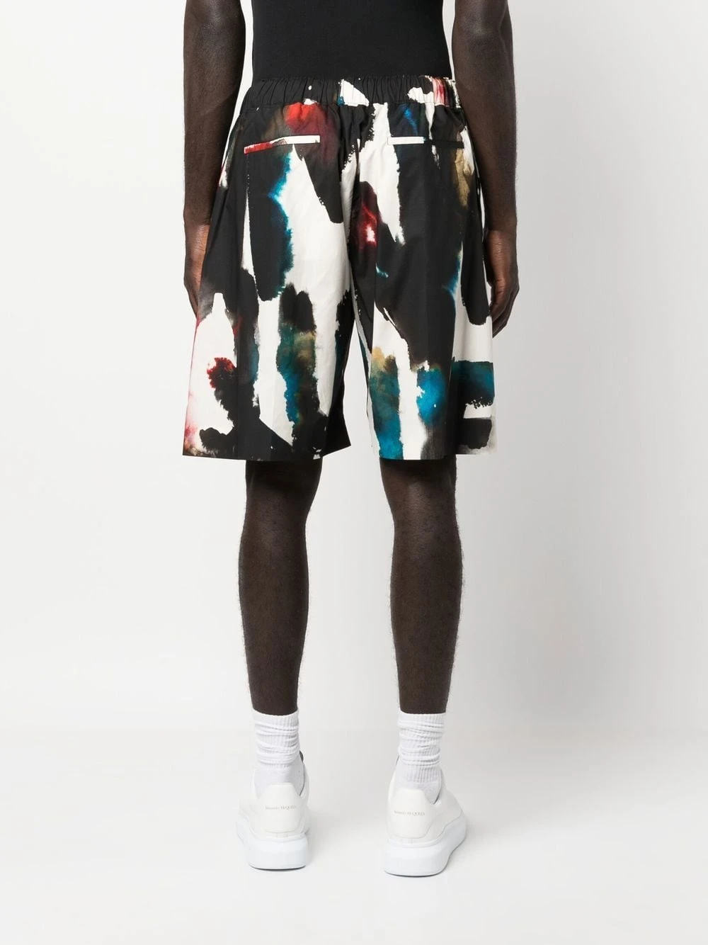 logo-print straight-leg shorts from Alexander McQueen featuring two side inset pockets, two rear welt pockets, black/multicolour, cotton, all-over logo print and elasticated waist. Printed shorts This piece fits true to size. We recommend you get your regular size. Model is 1,84m / 6ft 1in wearing size 48 (IT)Item #: