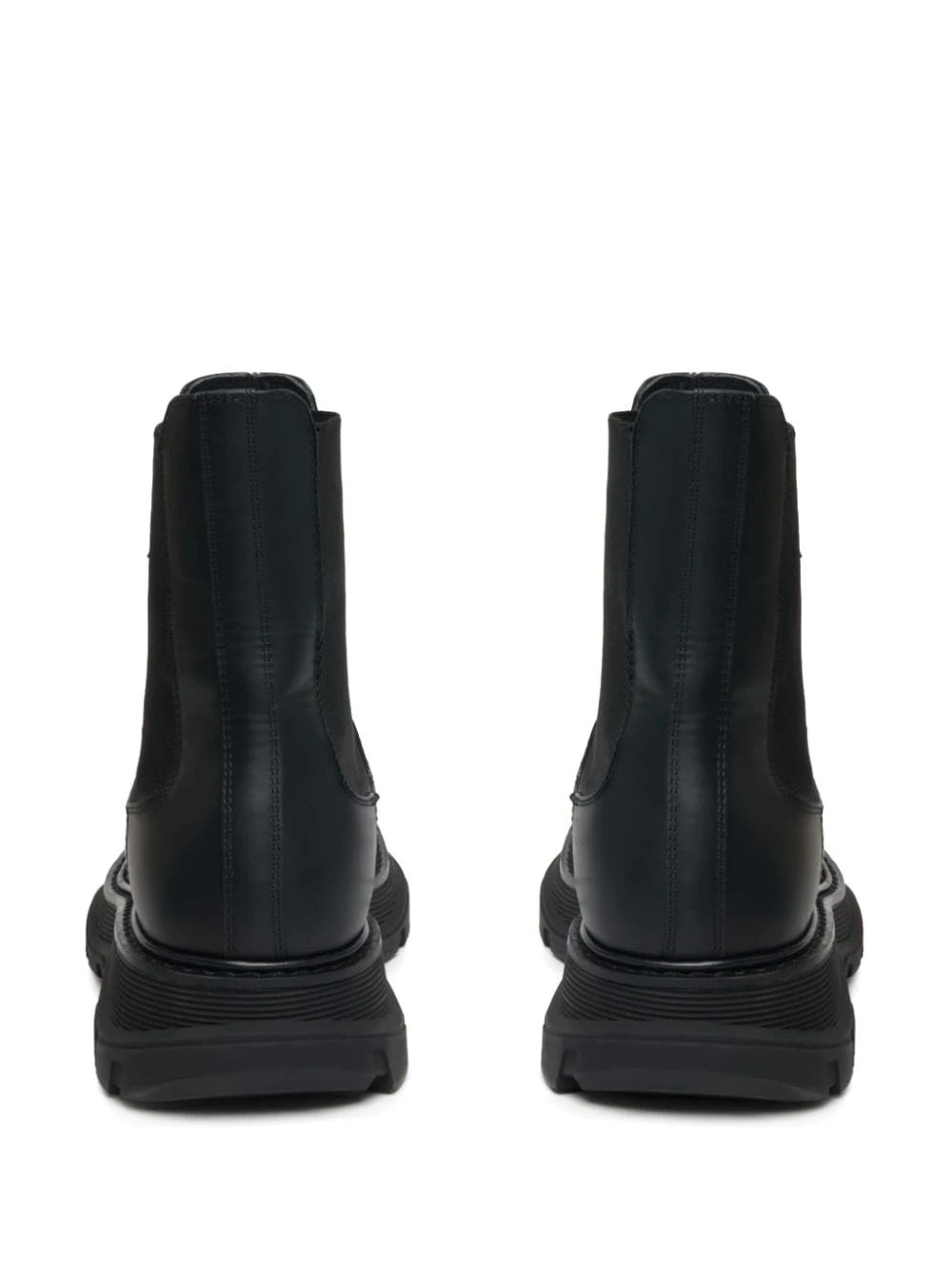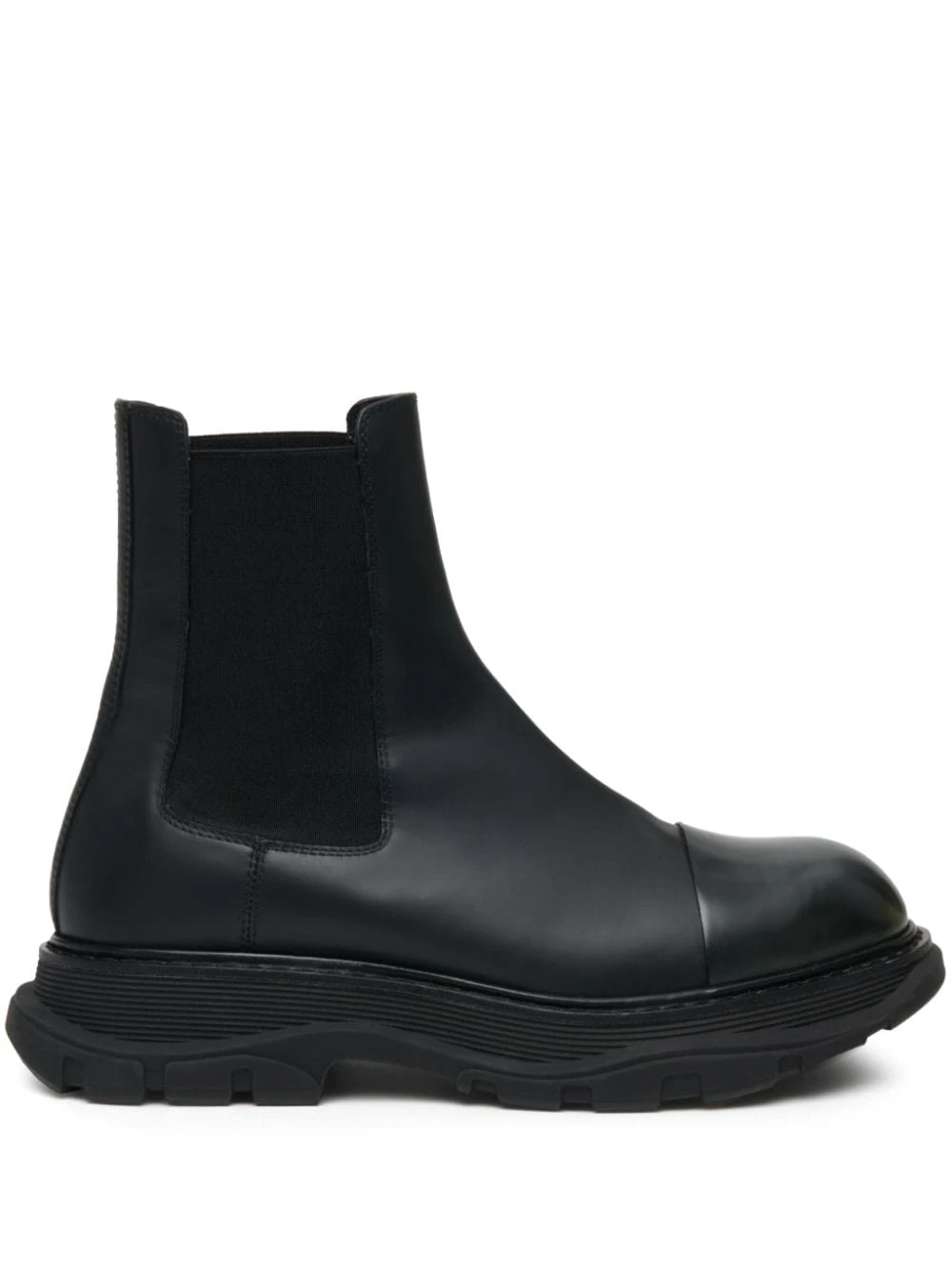 Wander leather Chelsea boots from Alexander McQueen featuring black, calf leather, elasticated side panels, round toe, branded leather insole, chunky rubber lug sole and galosh-inspired rubber wrap. Leather chelsea boots Heel 1,8 in / 4,5 cm; Platform 1,4 in / 3,5 cmItem #: