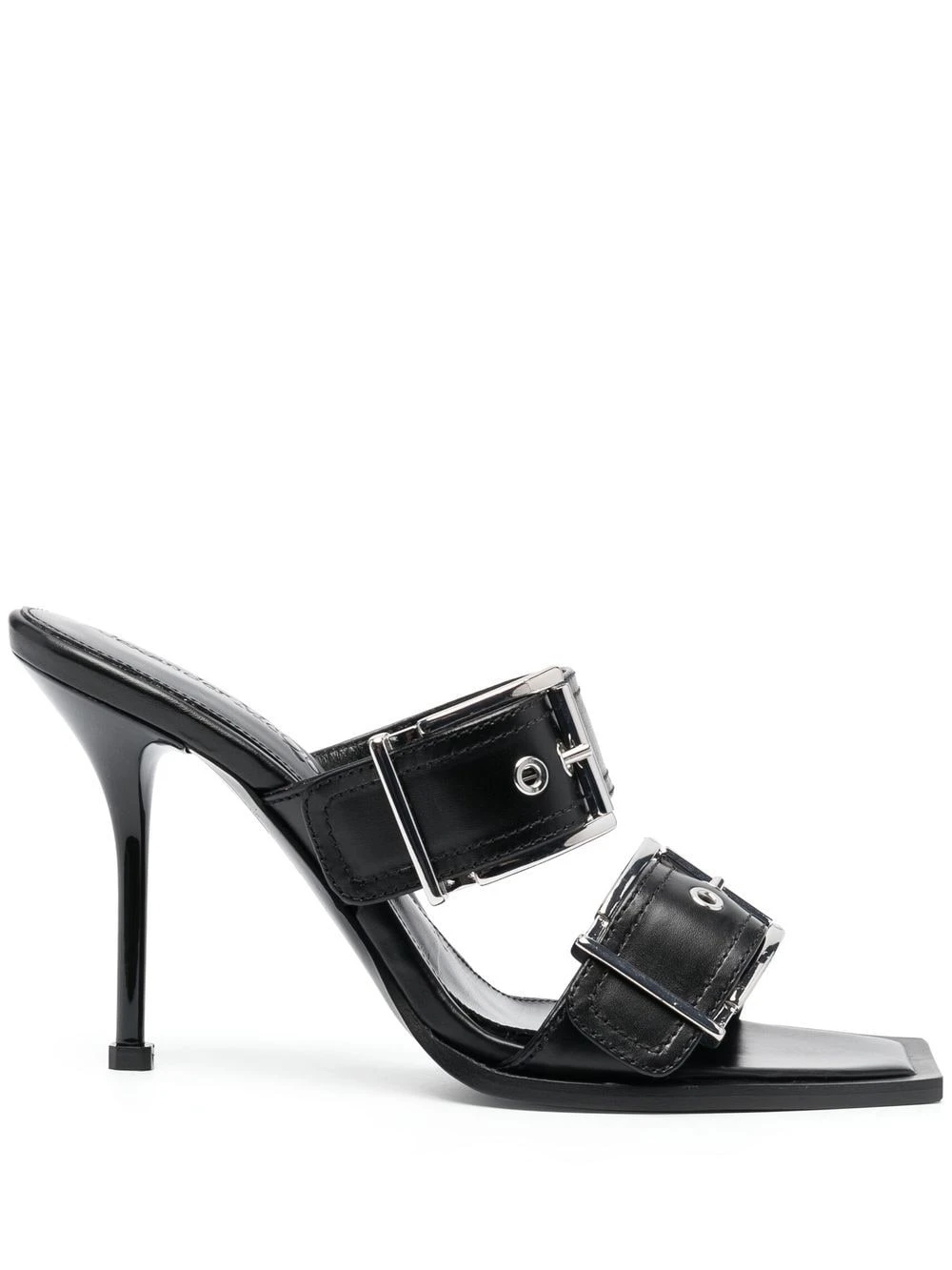 buckle-detail sandals from Alexander McQueen featuring black, calf leather, buckle detail at the toe, branded insole, high stiletto heel and square toe. Punk double buckle leather sandals Heel 4,1 in / 10,5 cm; Platform 0,4 in / 1 cmItem #: