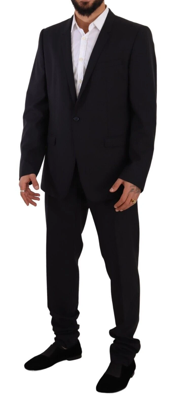 Gorgeous brand new with tags 100% Authentic Dolce & Gabbana 2 piece suit. Deconstructed blazer with notch lapels and one-button closure. The trousers feature a concealed zip and button closure, front slanted pockets, one watch pocket and two back welt pockets with buttons. Pressed pleats and unfinished hems.