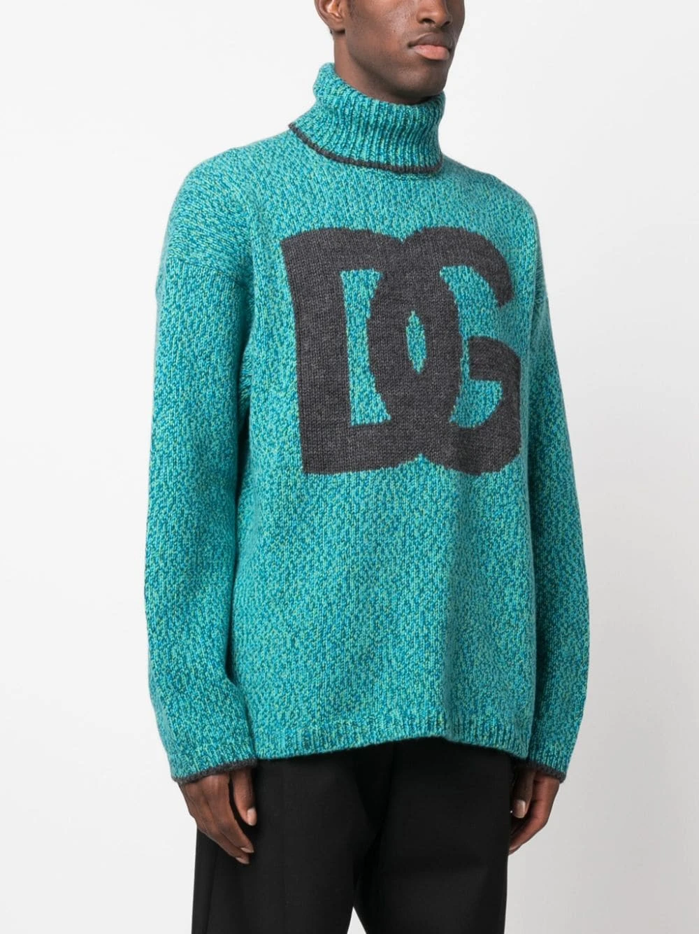 intarsia-knit logo jumper from DOLCE & GABBANA featuring ribbed cuffs and hem, mélange effect, intarsia-knit logo, roll neck, sea green, black, wool blend, long sleeves and straight hem. Wool blend high neck sweater This piece fits true to size. We recommend you get your regular size. Model is 1,84m / 6ft 1in wearing size MItem #: