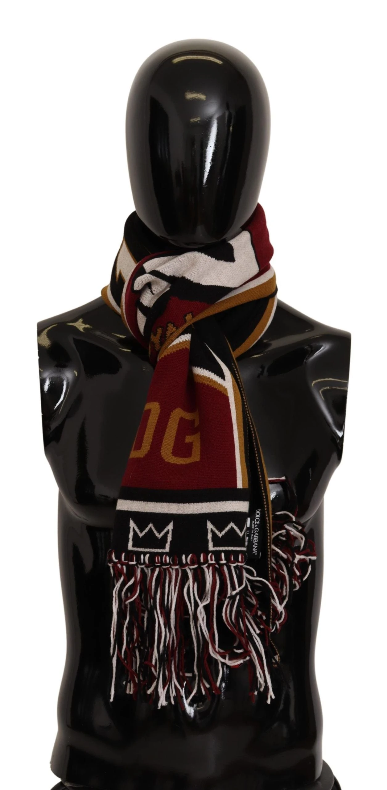 Gorgeous brand new with tags, 100% Authentic Dolce & Gabbana multicolor wool scarf with ‘DG King’ lettering and crown. Fringed ends with logo. Solid colour lining.