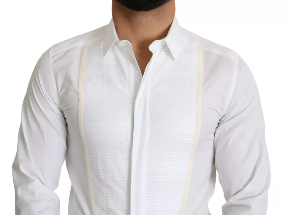 Absolutely stunning, 100% Authentic, brand new with tags Dolce & Gabbana cotton shirt with Gold fit. It features pleated plastron, spread collar, back yoke and box pleat. One-button cuffs.