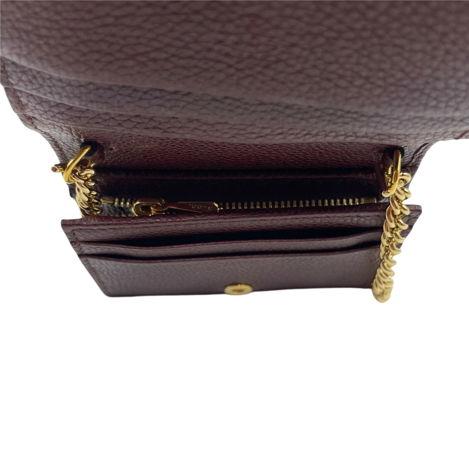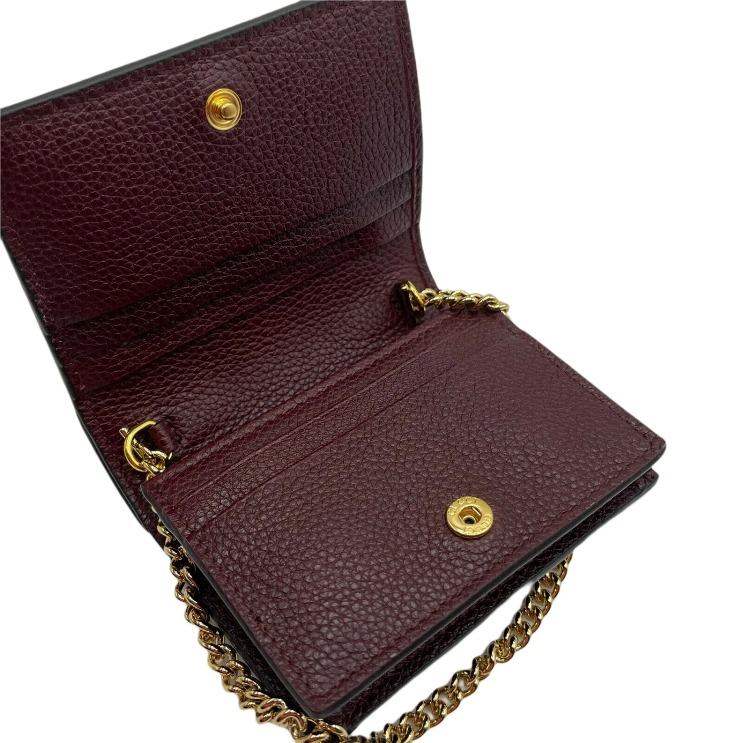 Be the first to review “Gucci Zumi Burgundy Leather Gold Chain Bi-Fold Mini Wallet” Cancel reply