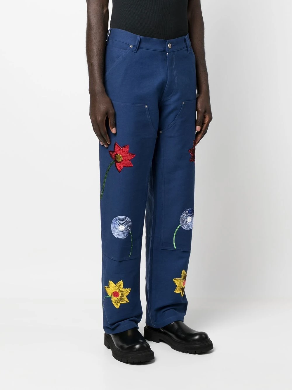 sequin-embellished detail trousers from Sky High Farm featuring sequin embellishment, belt loops, front button and zip fastening, two side inset pockets, two rear patch pockets, medium blue and cotton. Embroidered denim jeans This piece fits true to size. We recommend you get your regular size. Model is 1,84m / 6ft 1in wearing size MItem #: